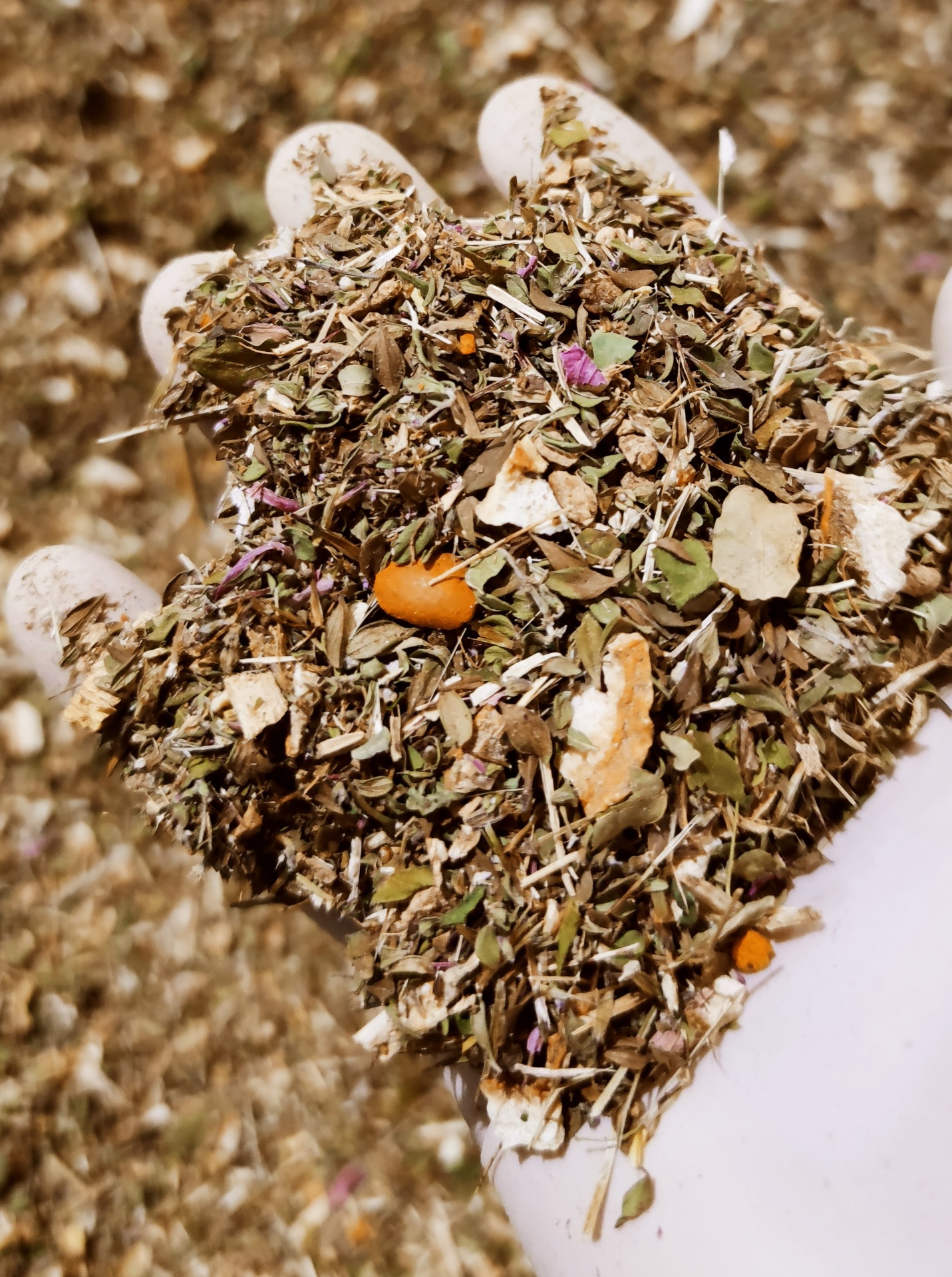 Echinacea, lemon thyme, sweet wormwood, ginger, pieces of lemon, licorice, turmeric, moringa and black pepper.