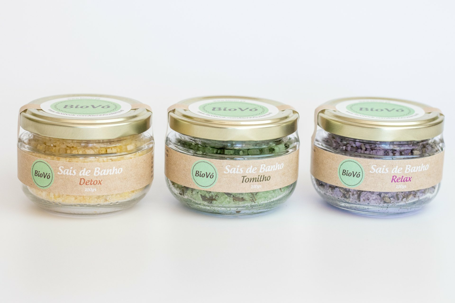 Os sais de banho da BioVó são produzidos com Sal de Rio Maior e óleo de grainha de uva. Existem 3 variedades diferentes.