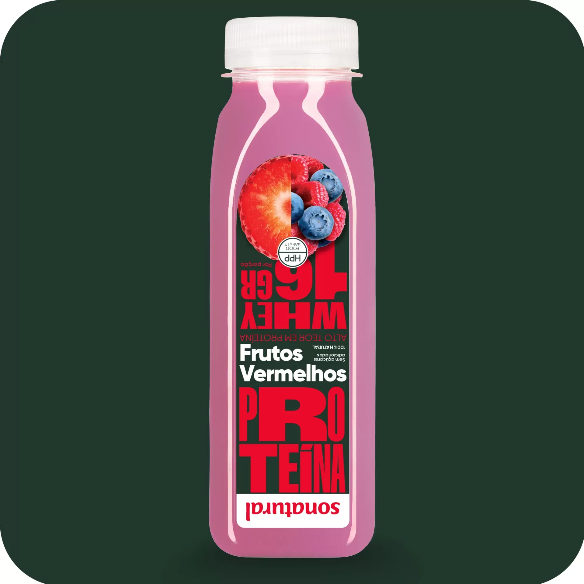 Delicioso sumo de Frutos Vermelhos com adição de Proteína Whey. Sem açúcar, para levar e beber onde quiser.